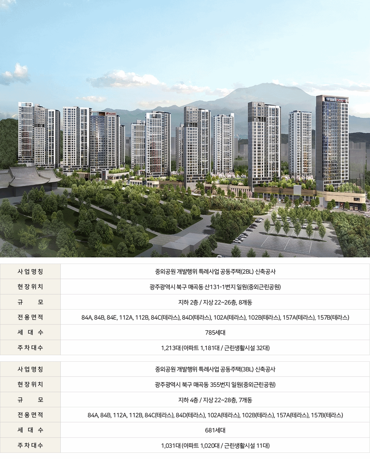 광주 두 번째 규모의 중외공원 특례사업으로 조성되어 공세권의 쾌적함과 희소성을 동시에 누리는 프리미엄 단지입니다.